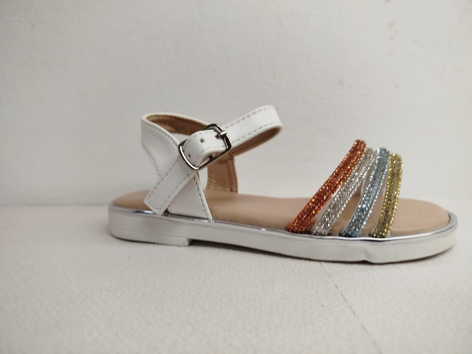 SANDALIA BLANCA INFANTIL CON TIRAS DECORATIVAS DE COLORES BRILLANTES