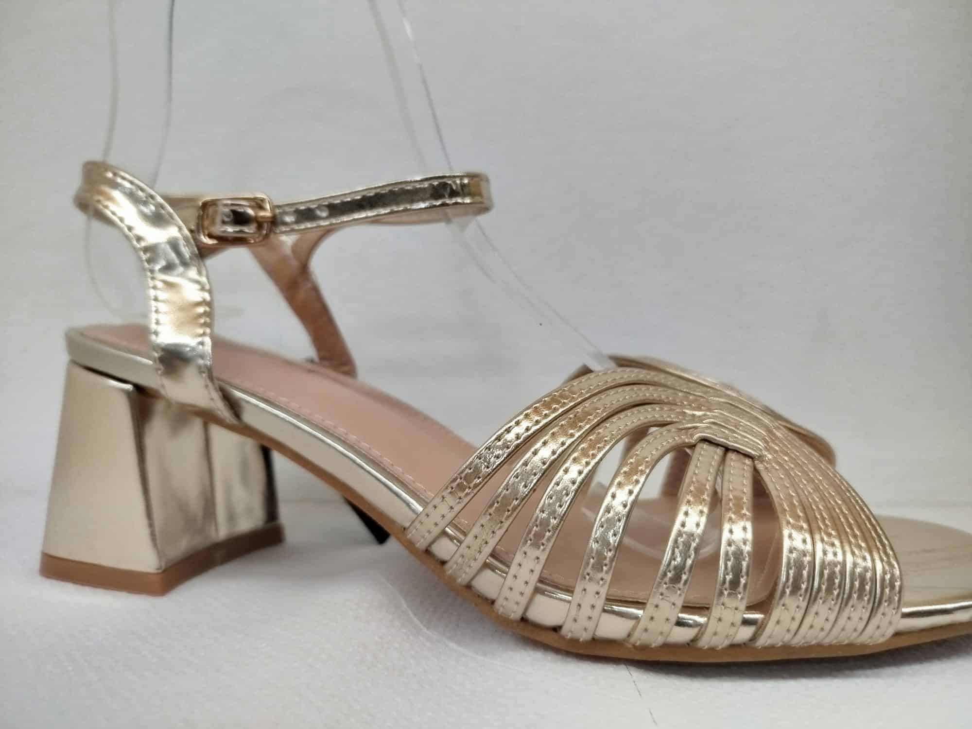 SANDALIAS COLOR CHAMPÁN, DE TACON ANCHO, CON TIRAS DORADAS, IDEALES PARA EVENTOS Y FIESTAS